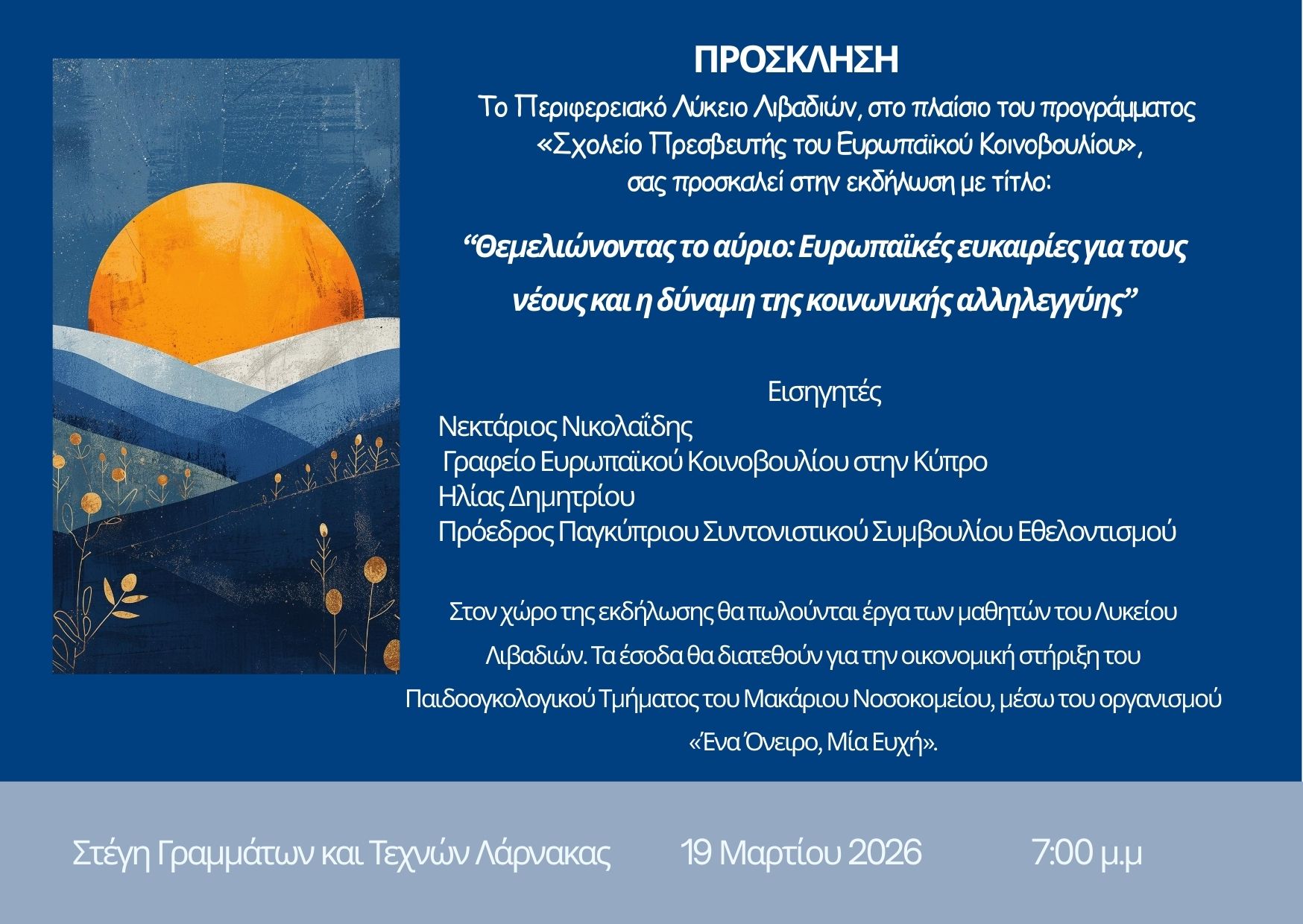 ‘Το Λύκειο Λιβαδιών προσκαλεί γονείς και μαθητές σε μια ενδιαφέρουσα ενημερωτική εκδήλωση για τα προγράμματα πρακτικής άσκησης (internships) στην Ευρωπαϊκή Ένωση και τις δράσεις εθελοντισμού που μπορούν να ανοίξουν νέους δρόμους για την απόκτηση πολύτιμων εμπειριών και την ανάπτυξη δεξιοτήτων.’